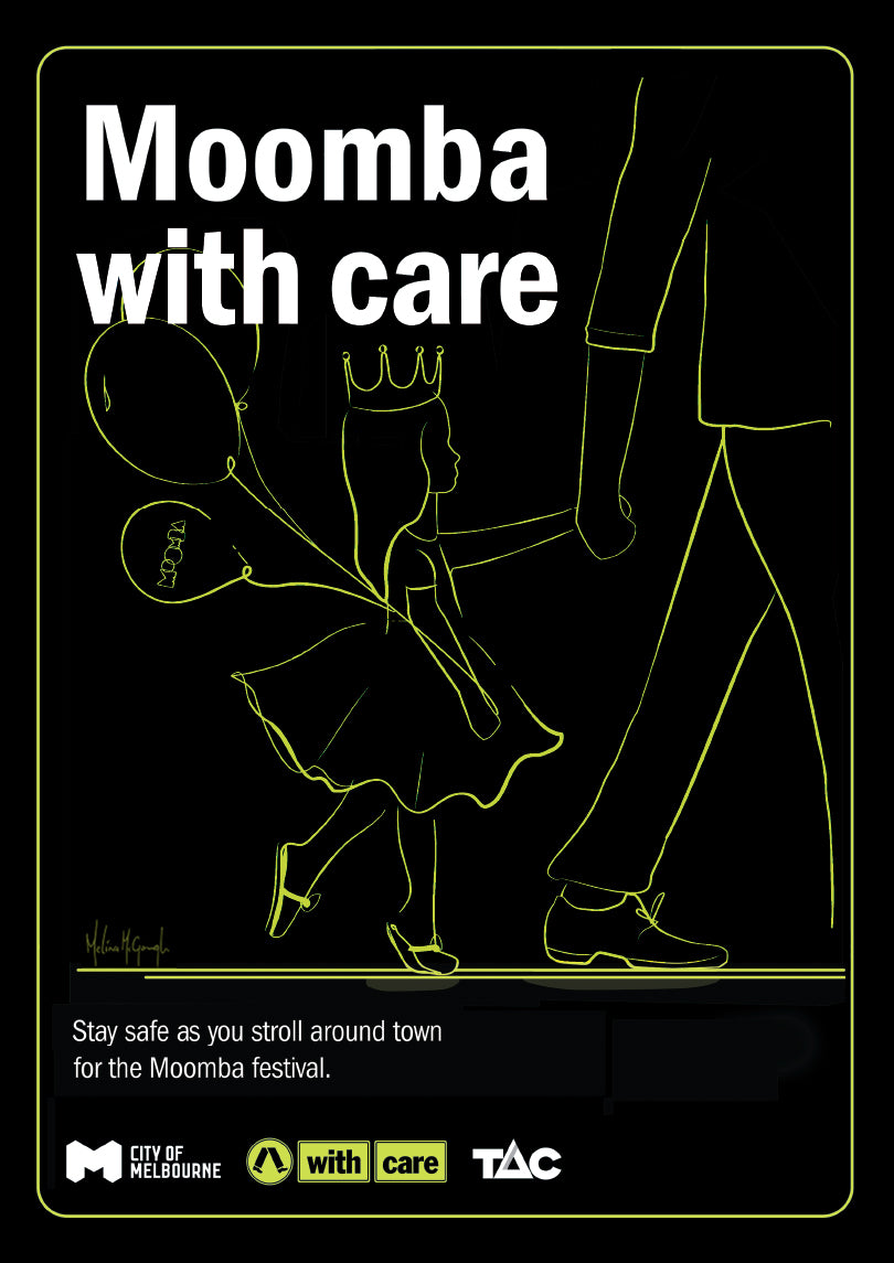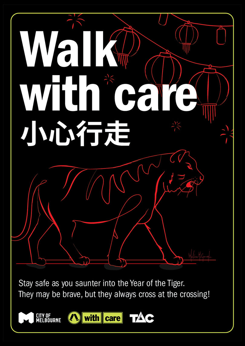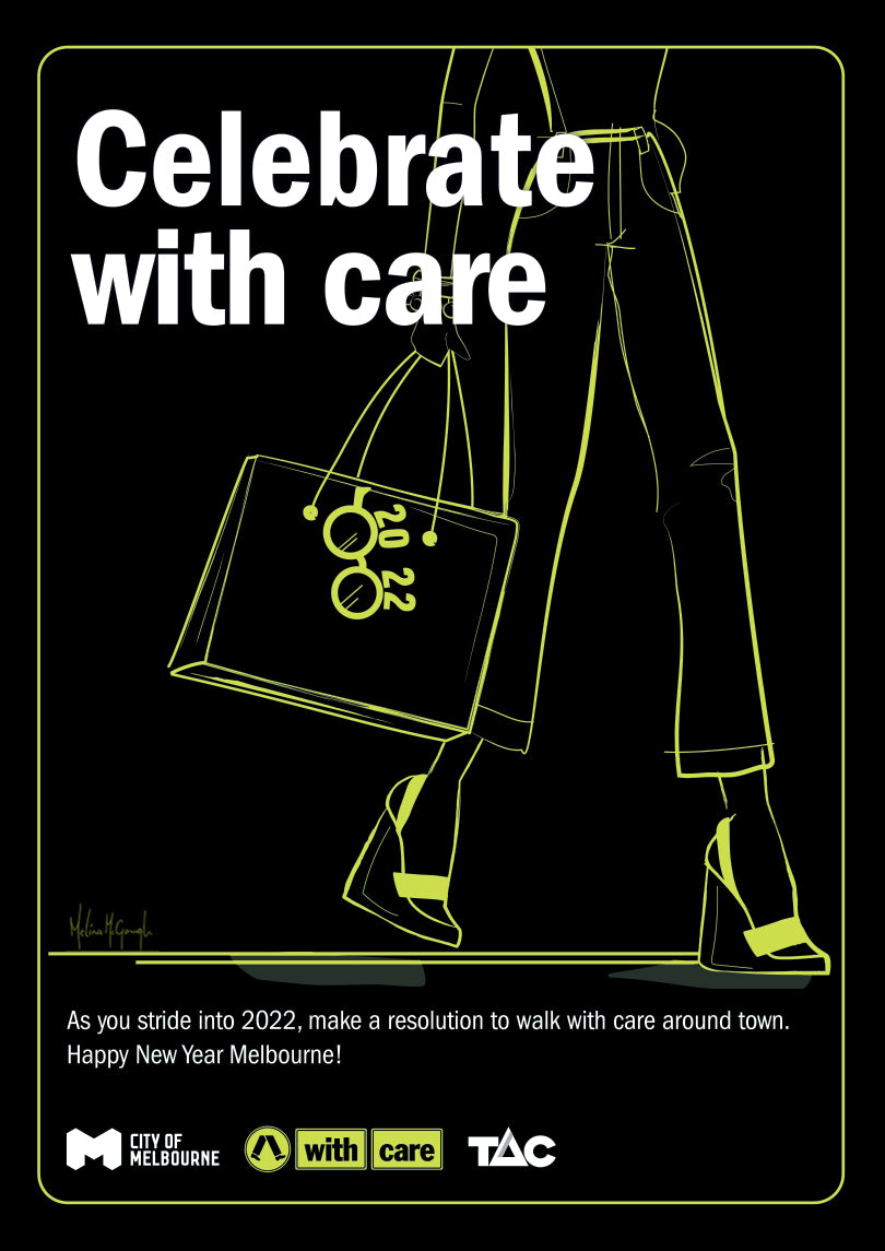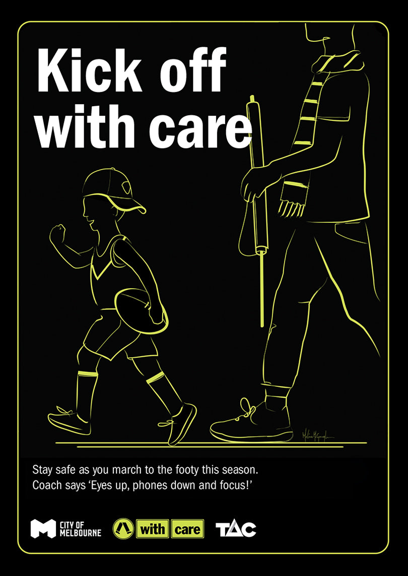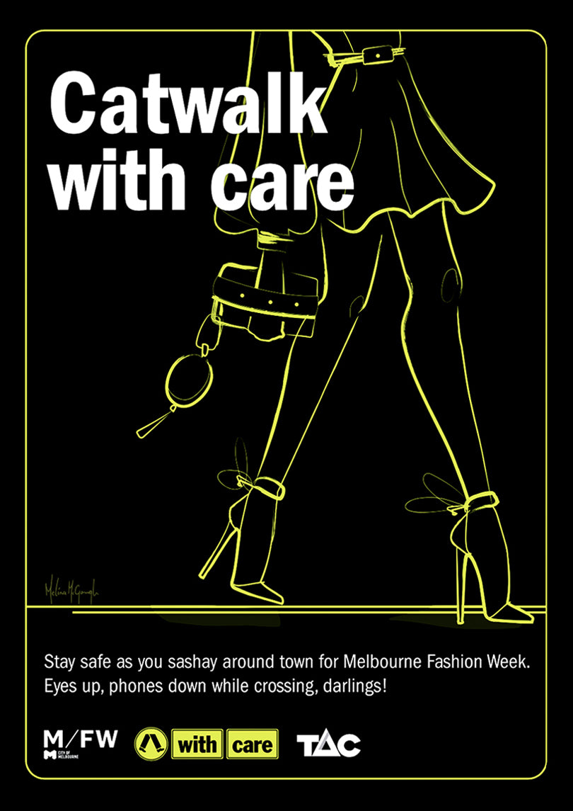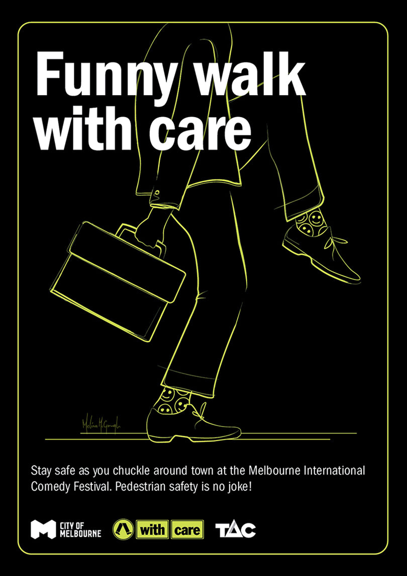 The idea for each design was inspired by the respective showcased events. Keeping in theme with the ‘Walk with Care’ message, Melina created illustrations that focused on legs to promote safe walking around Melbourne streets.