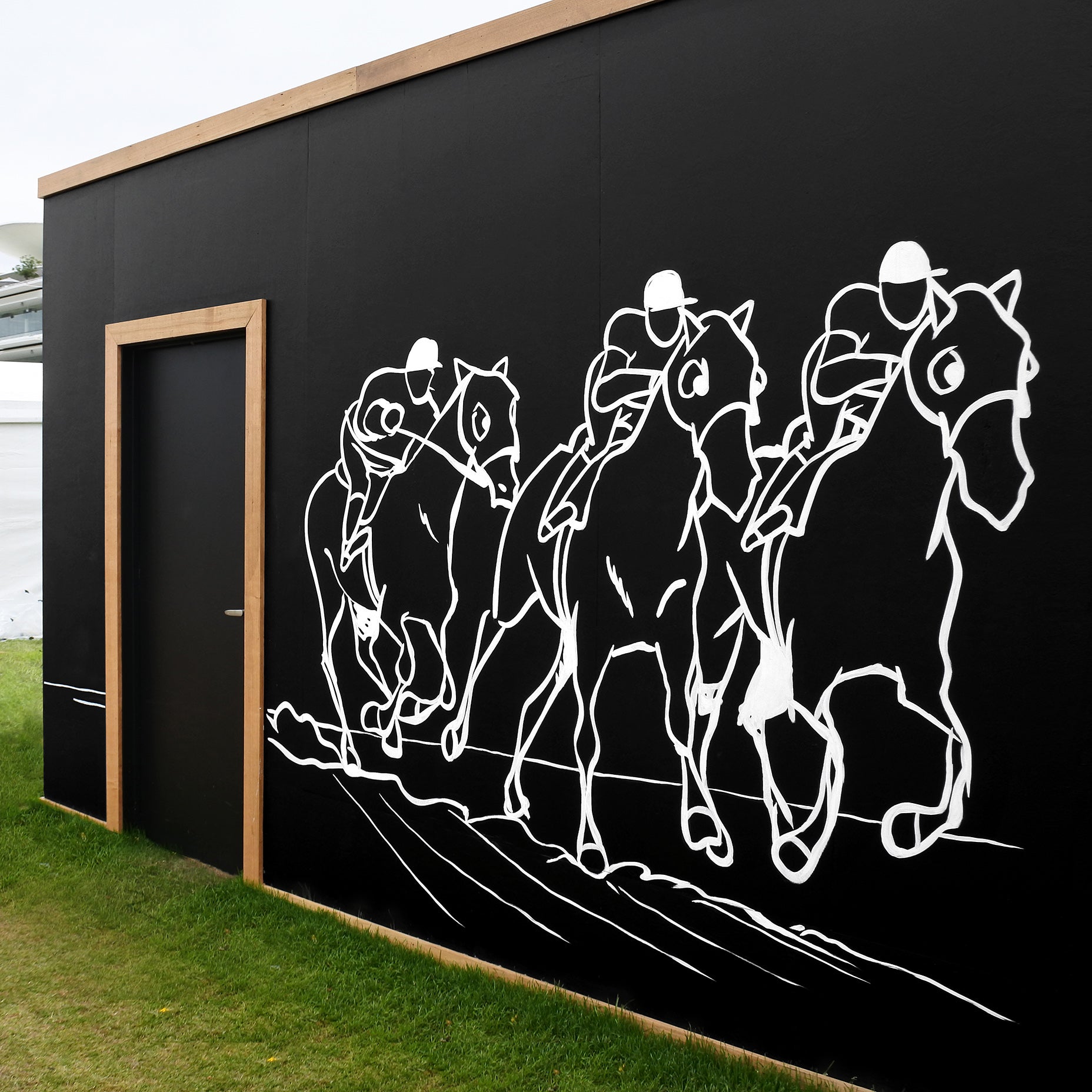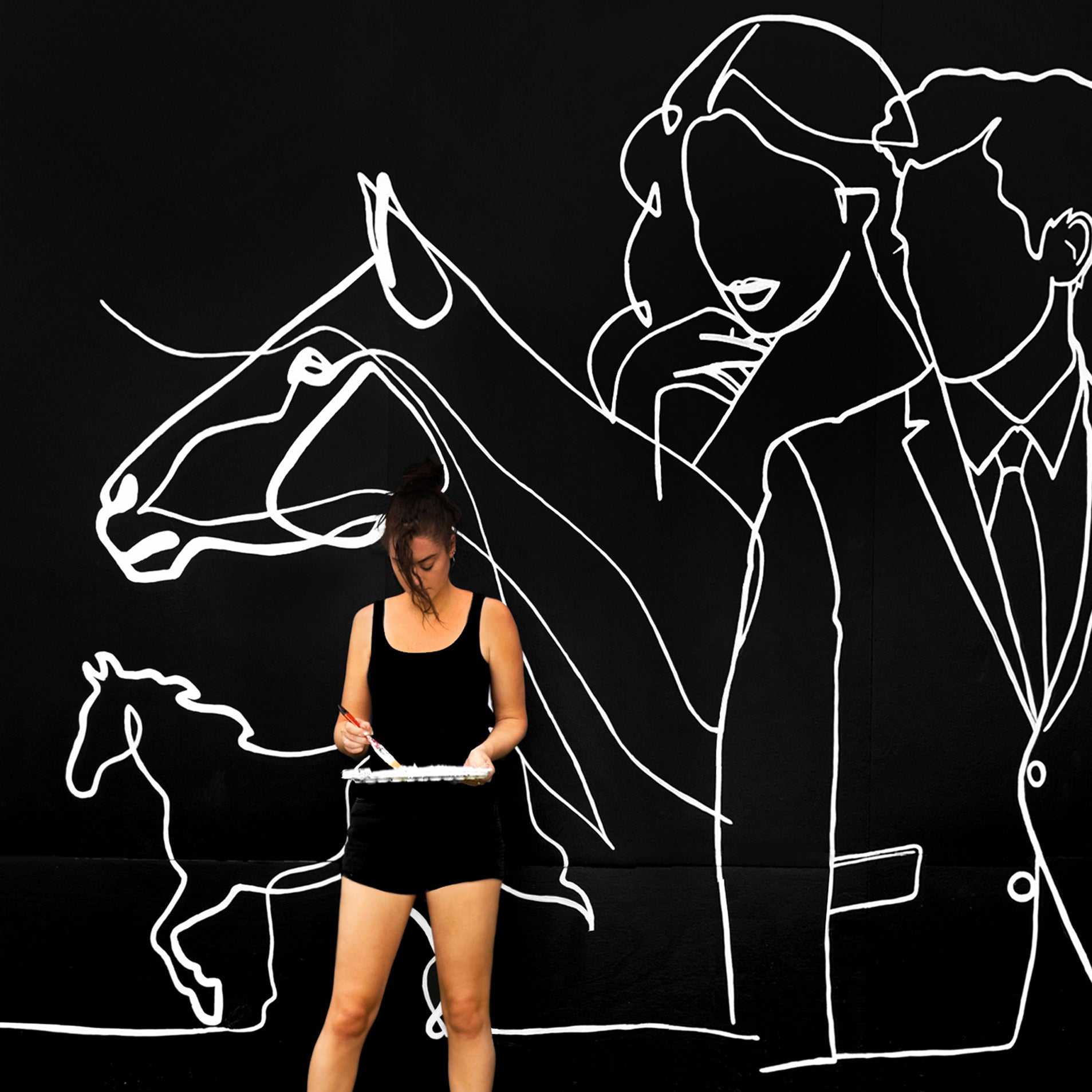Imagery of horses, people, fashion, food and words were painted in a minimalistic line art style; with a black backdrop and white paint.