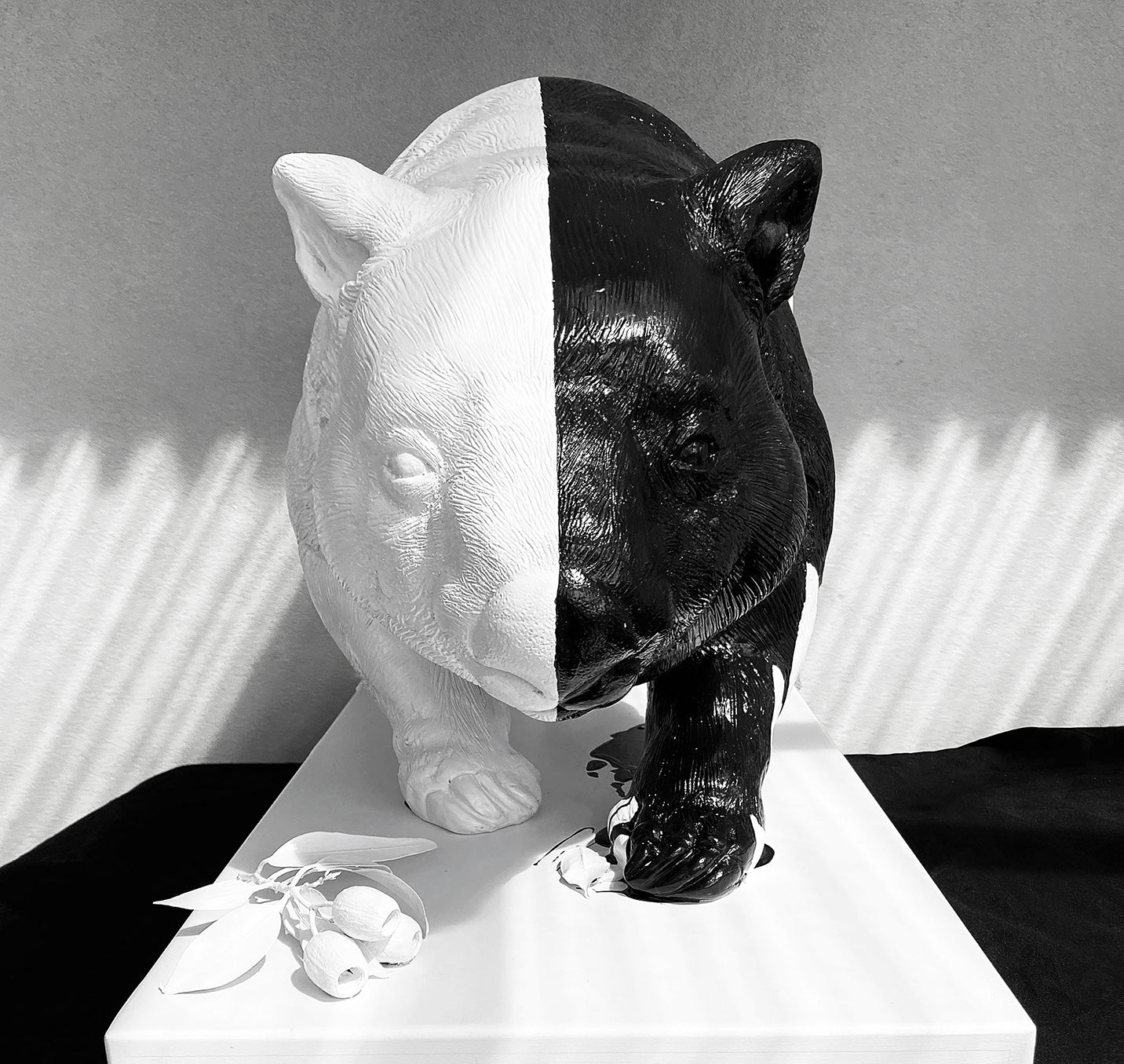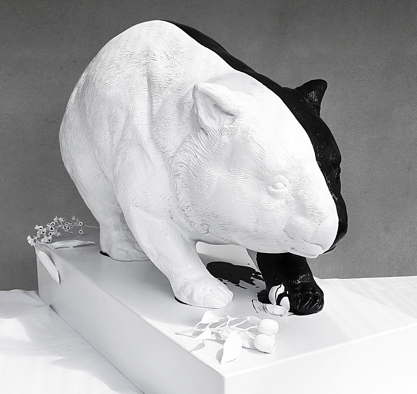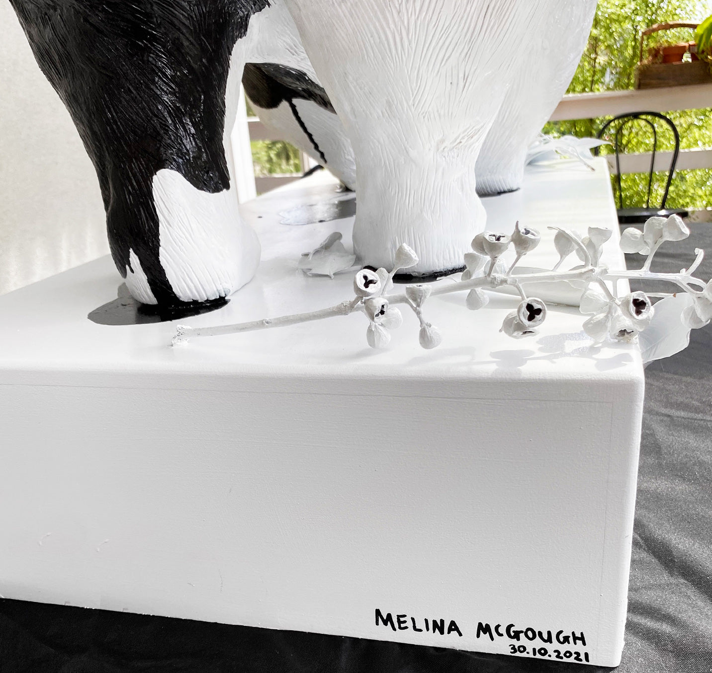 Gumnuts and leaves were collected, which were painted then added to the sculpture, reinforcing the natural environment as well as a black footprint, giving it a life-like feeling. With the intention to suit most homes with its minimal black and white aesthetic, it can be displayed either side to show a different look and perspective.